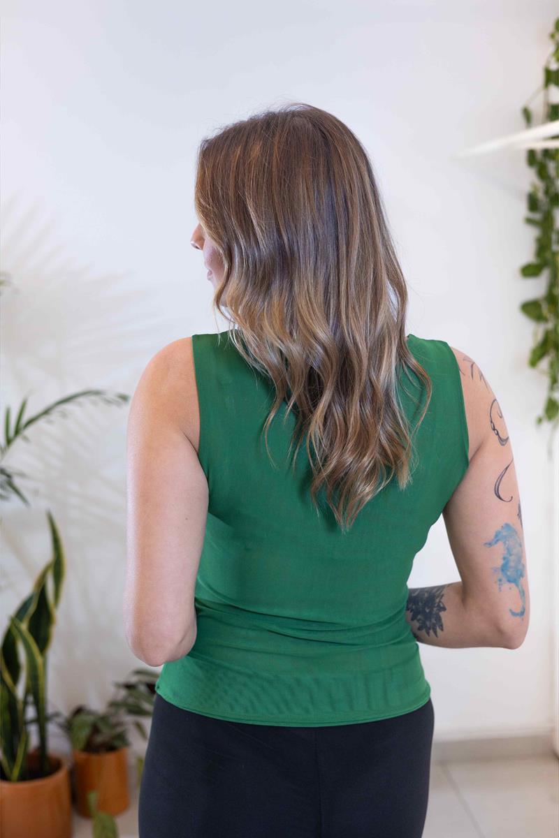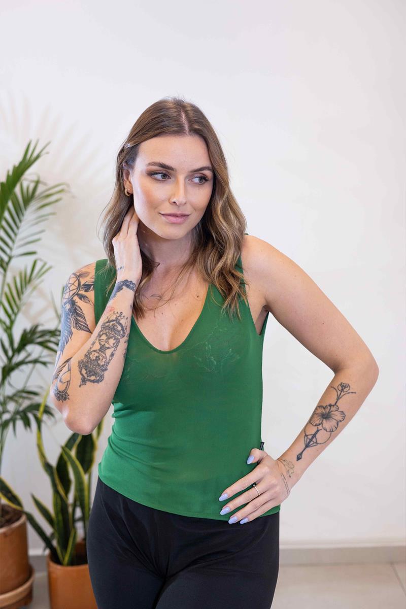 Regata em Tule Duplo é confeccionada em tule de poliamida 90% e elastano 10%, garantindo toque macio, elasticidade e conforto.