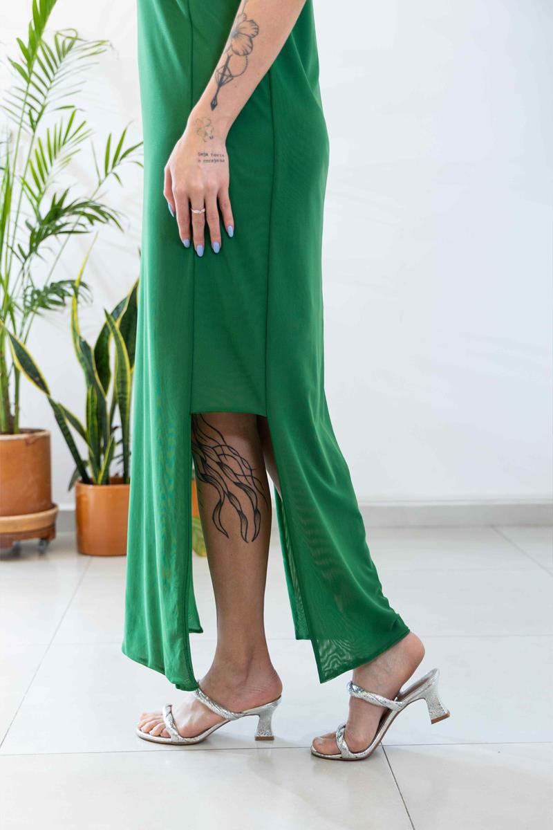 Vestido em tule duplo, com transparência reduzida e caimento leve. Acompanha forro que pode ser usado junto ou separado, permitindo diferentes composições e estilos.