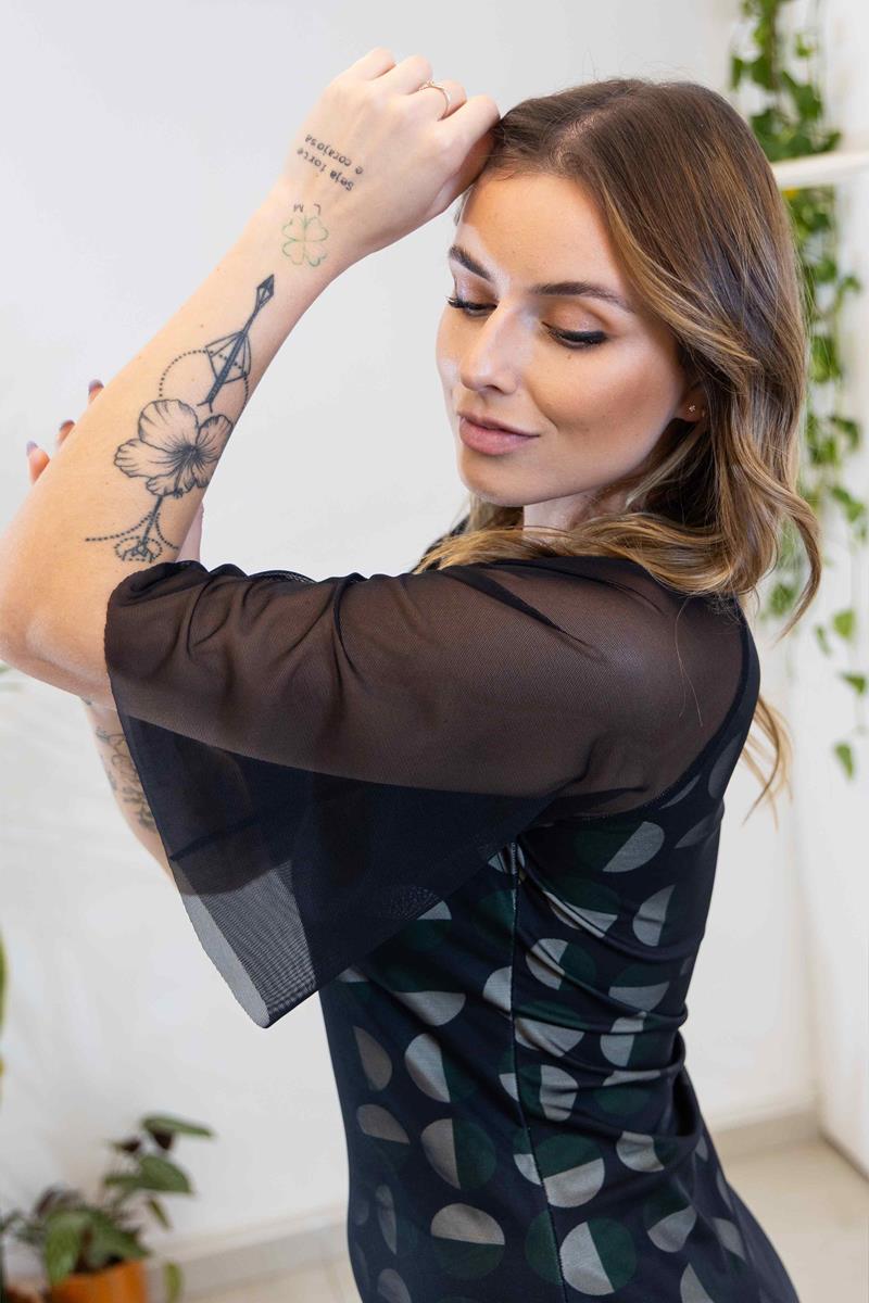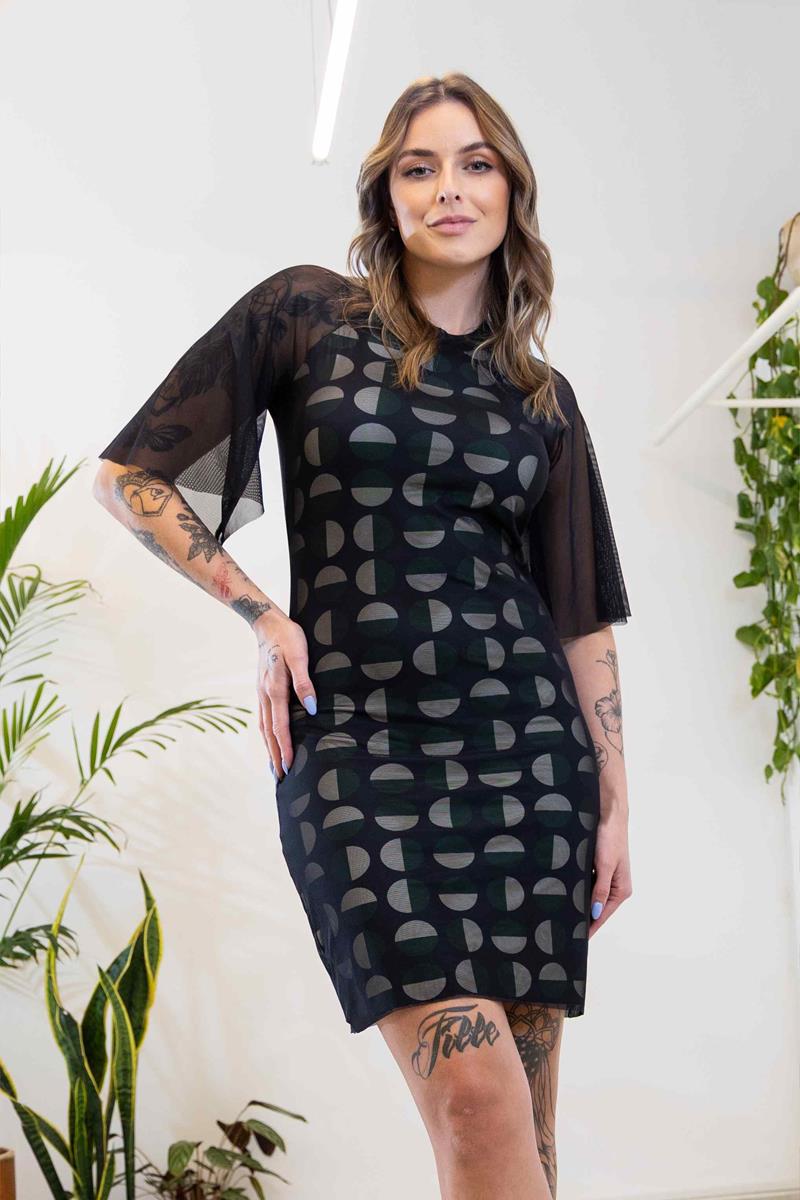 Vestido Solar, elegante e cheio de personalidade. Todo forrado, com forro acoplado ao tule, une conforto e estilo em uma só peça. O tule é liso e leve, enquanto o forro estampado — com círculos nas cores preto, branco e verde — traz o toque de originalidade que faz toda a diferença.