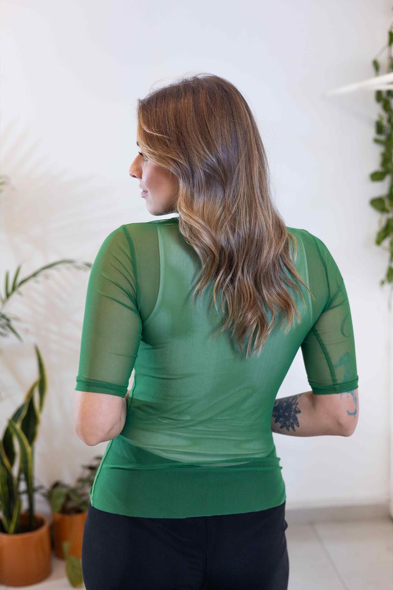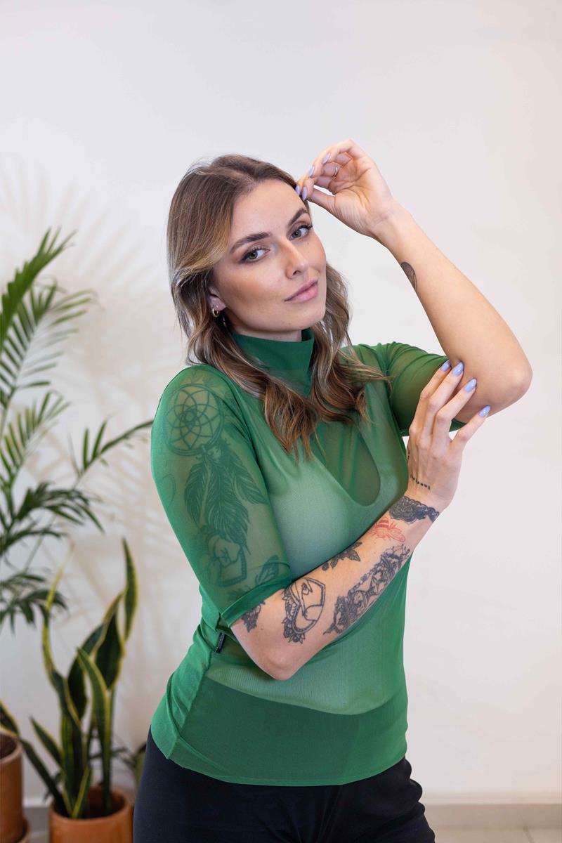 Confeccionada em tule de poliamida 90% e elastano 10%, a Blusa Tule Margot oferece leveza, maciez e caimento impecável.