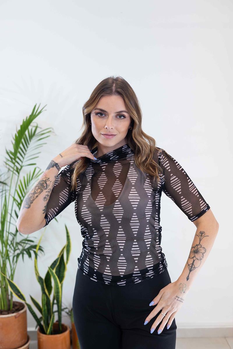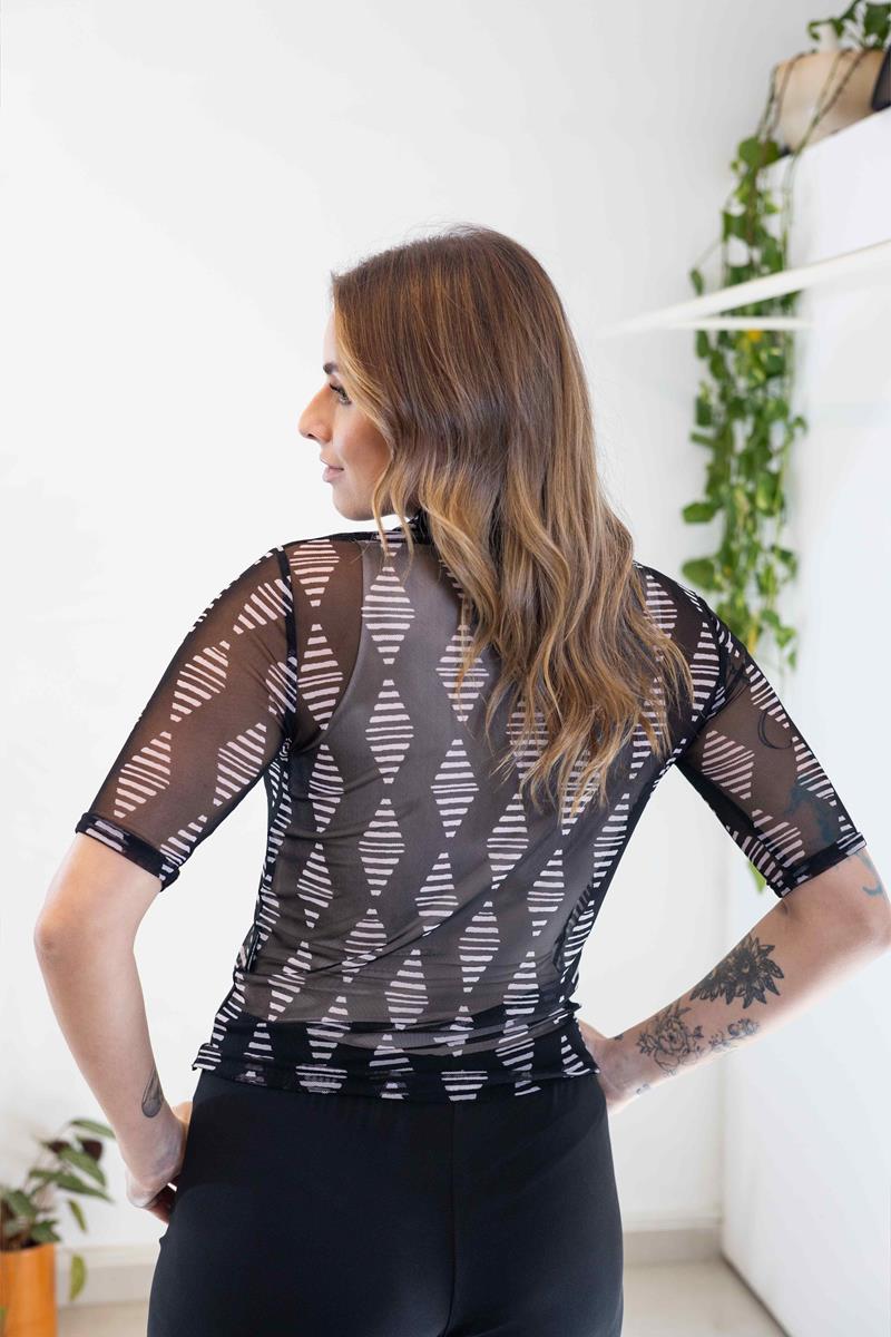 Confeccionada em tule de poliamida 90% e elastano 10%, a Blusa Tule Margot oferece leveza, maciez e caimento impecável.